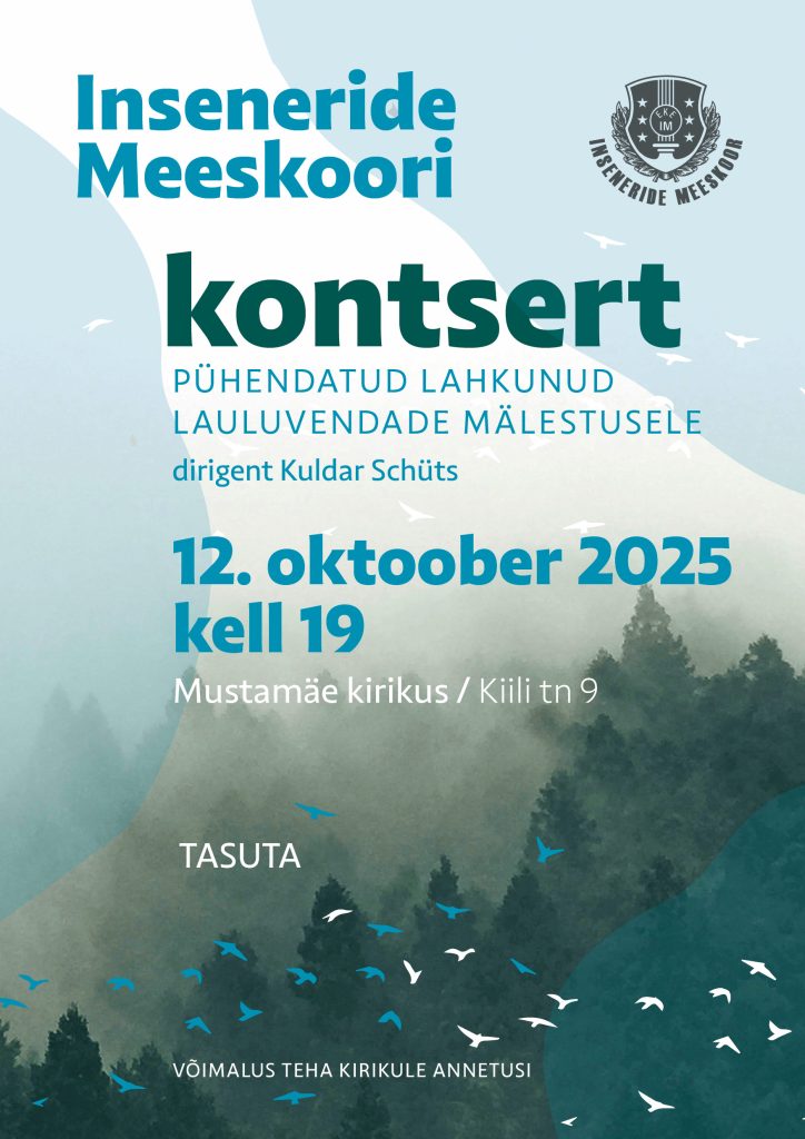Pühapäeval, 12. oktoobril kell 19 toimub Mustamäe Maarja Magdaleena kirikus Inseneride Meeskoori kontsert, mis on pühendatud lahkunud lauluvendade mälestusele. Dirigeerib Kuldar Schüts.