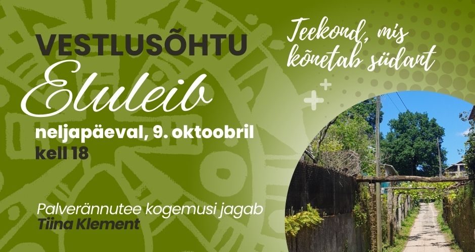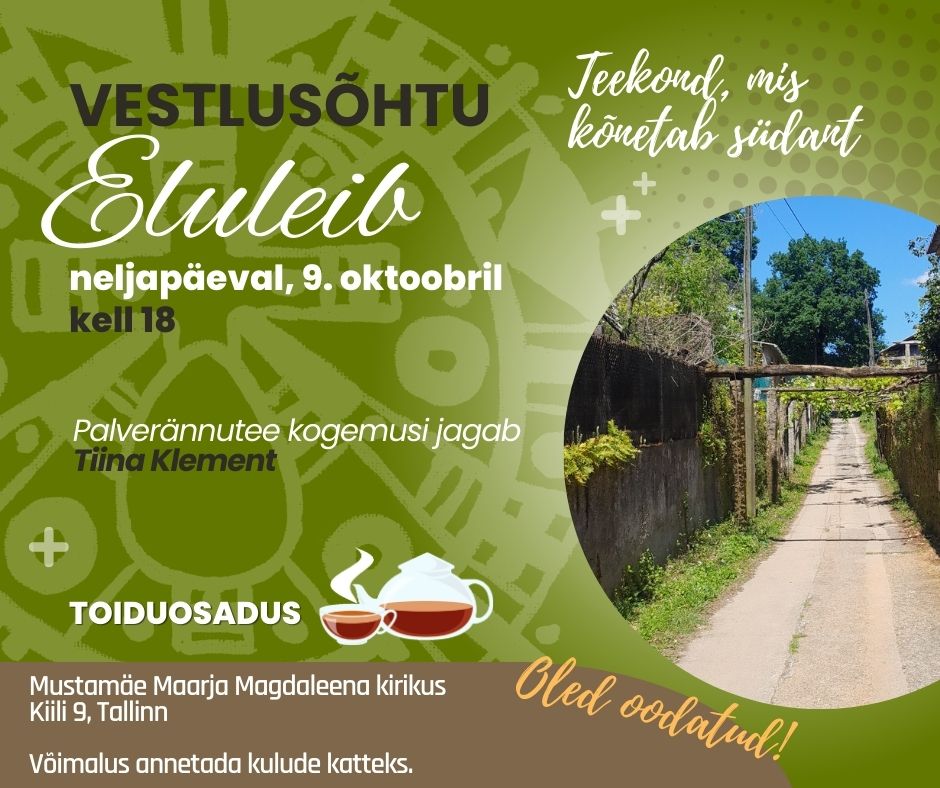 Neljapäeval, 9. oktoobril kell 18 alustab taas vestlusõhtute sari “Eluleib”. Hooaja avakülaliseks on meie enda Mustamäe koguduse õpetaja Tiina Klement, kes jagab kogemusi ja meenutusi pool aastat kestnud sabbaticus puhkuse ajal käidud palverännuteedest. Õhtu juurde kuulub hea muusika ja maitsev temaatiline toit. Oled südamest oodatud!