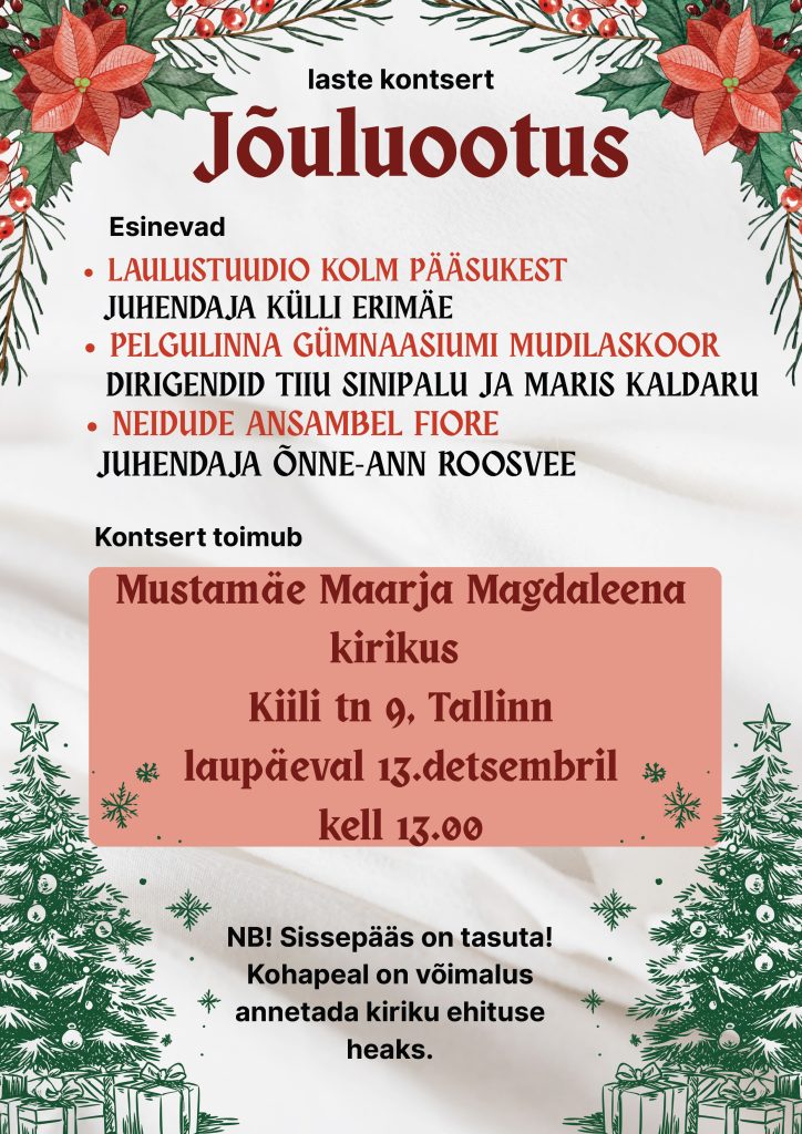 Mustamäe Maarja Magdaleena kirikus toimub laupäeval, 13. detsembril kell 13.00 armas jõuluootuse kontsert, kus esinevad mitmed lastekollektiivid: