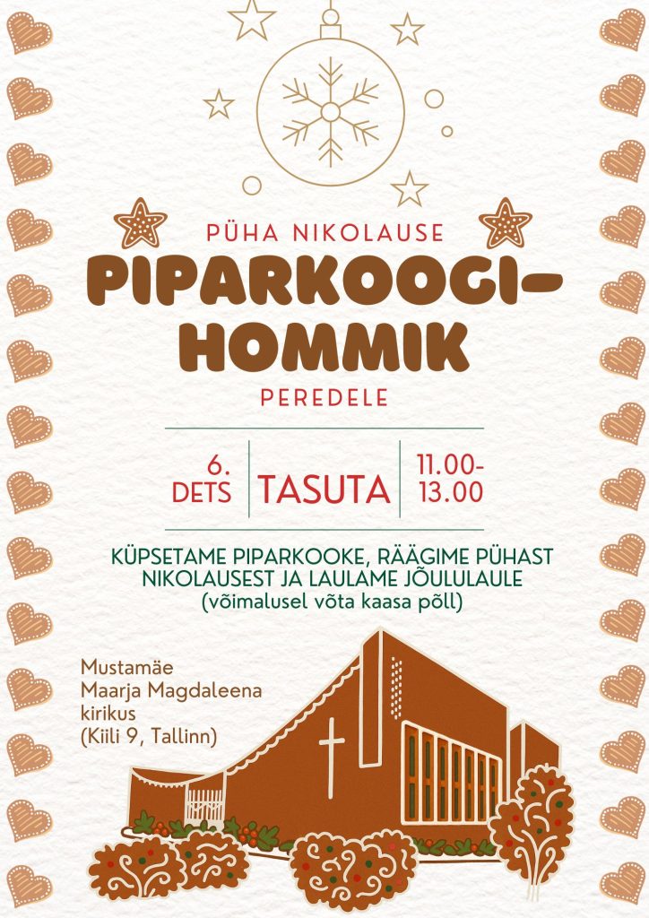 Magus ja tegevusi täis laupäev ootab kõiki peresid Mustamäe kirikusse! Küpsetame maitsvaid piparkooke, räägime Pühast Nikolausest ehk esimesest jõuluvanast, laulame jõululaule ning teeme koos advendiaega sobivaid mänge ja tegevusi. Võimaluse korral võta kaasa oma põll!