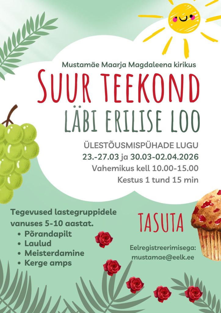 Lasteaedadele ja algklassidele suunatud programm ülestõusmispühadeks ootab ees 23. märtsist kuni 2. aprillini Mustamäe kirikus. Jõulude ajal väga populaarseks osutunud programm käsitleb seekord ülestõusmispühade temaatikat. Kasutame põrandapilte, mille põimime kokku laulude ja käeliste tegevustega. Lapsed saavad programmi lõpus väikese ampsu enne teele minekut. Programmis osalemine on tasuta. Soovi korral võib teha annetuse Mustamäe Maarja Magdaleena kogudusele.