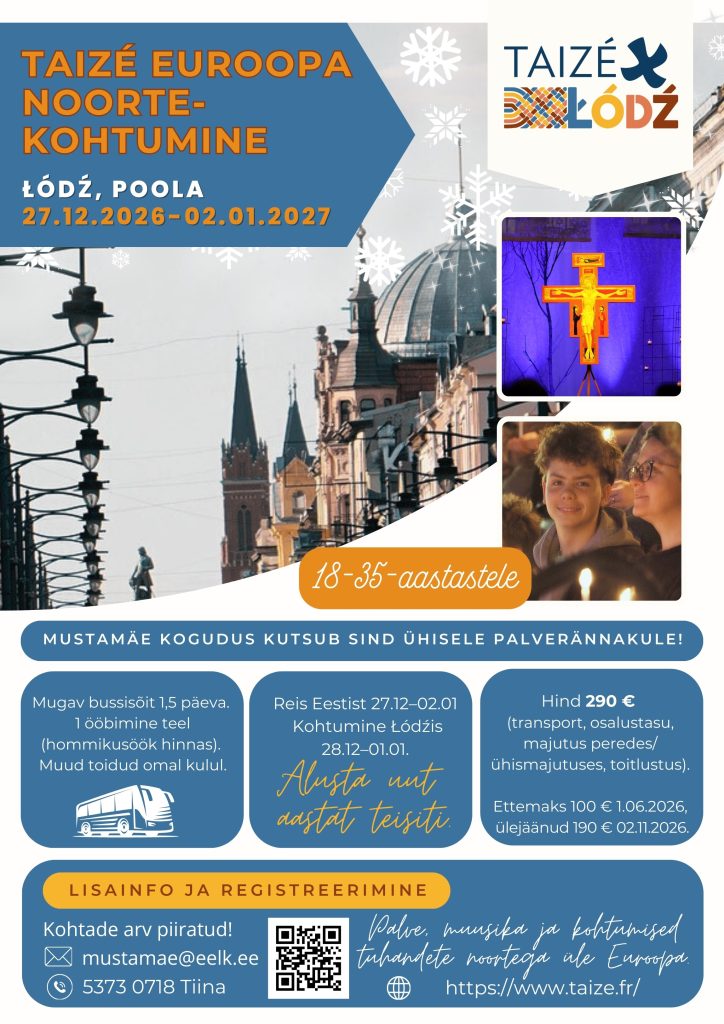 Taizé Łódź Euroopa noorte aastavahetuse kohtumine toimub 28.12.2026 – 01.01.2027. Łódźis on toitlustus ja ööbimised organiseeritud korraldaja poolt peredes või ühismajutuses (võta igaks juhuks kaasa magamiskott Łódźi jaoks). Oodatud on noored täiskasvanud vanuses 18-35 eluaastat.