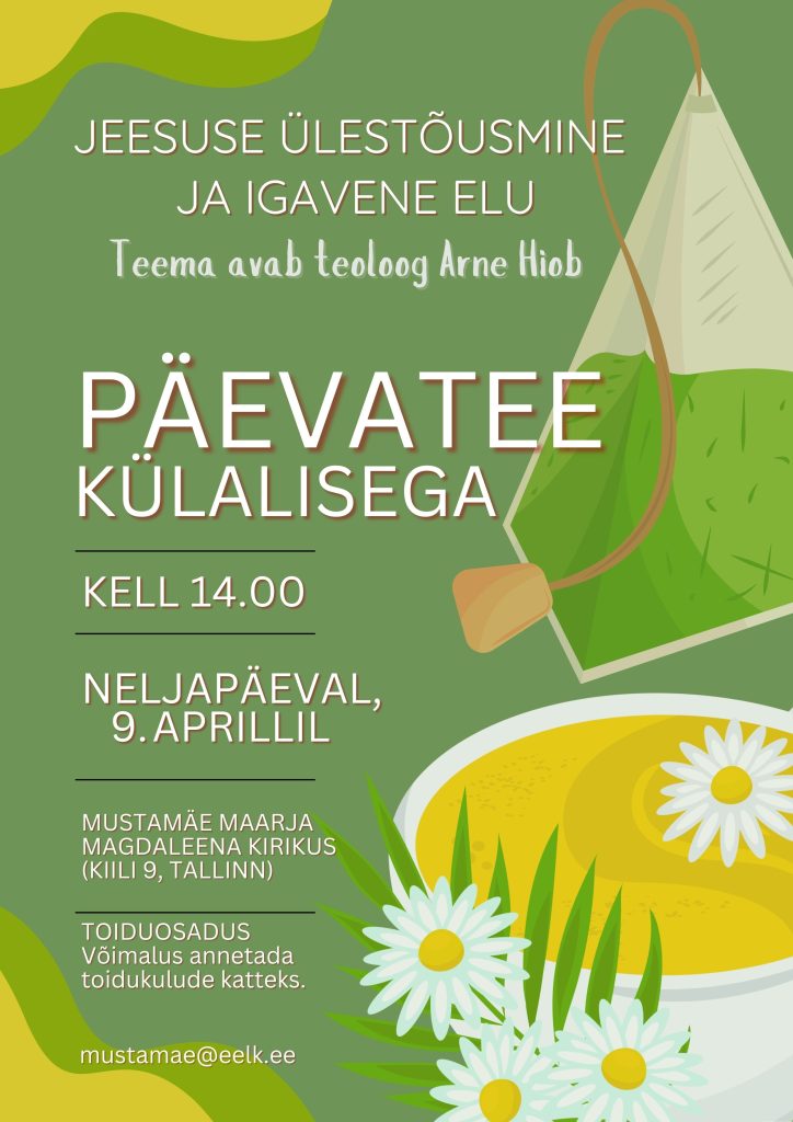 „Päevatee külalisega“ pakub mitmekesist ja sisukat koosolemist. Kohtumistel kõlab elav muusika, on vaimulik mõtisklus ning ühine koosviibimine toiduosaduses. Igal kohtumisel on külaline – inimene, kellel on jagada oma lugu, teadmisi või elutarkust. Räägitakse erinevatel teemadel, mis on eelkõige olulised ja huvitavad vanemas eas inimestele: elukogemusest, usust, tervisest, kultuurist ja maailmas toimuvast. Seekordseks külaliseks on teoloog Arne Hiob ja teemaks “Jeesuse ülestõusmine ja igavene elu”.